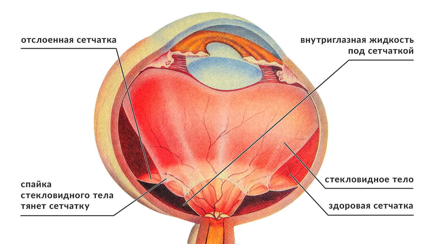На поздних стадиях диабетической ретинопатии внутри глаза идёт рост соединительной ткани. Каждое крупное кровоизлияние оставляет после себя рубцы. Они тянут на себя сетчатку и отрывают её от места прикрепления. Так возникает грозное осложнение диабета — тракционная отслойка сетчатки.
